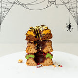 Rich chocolate donut topped with smooth pumpkin spice filling, dipped in dark chocolate, and finished with pumpkin seed brittle and spooky pumpkin choc drizzle.